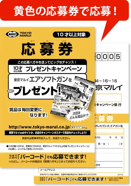 対象商品(10才以上用エアソフトガン / 14才以上推奨エアソフトガン)に付属しているプレゼント応募券(10才以上対象)に必要事項をご記入のうえ、切手を貼って投函してください。