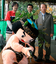 写真右より、小山町の込山町長、日本フラッグハント協会理事の湯村氏、東京マルイ広報。手前は小山町のマスコットキャラクター・金太郎です。