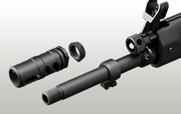 フラッシュハイダーは、最後にバレルナットを締めて固定するダブルナット方式。14mm逆ネジ仕様なので、同規格の各種マズルオプションにも対応しています。
