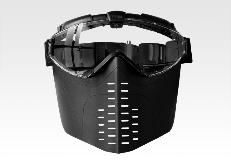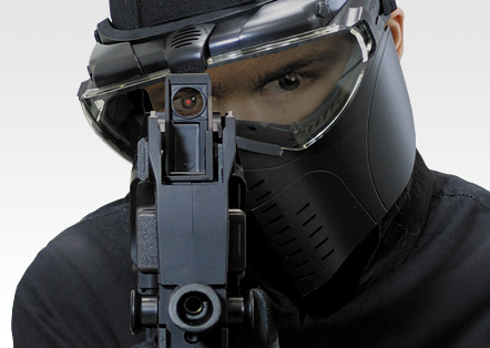 - フェイスガード標準装備:ゴーグルに取り付けられたフェイスガードが顔全体をカバー。ストックにほお付けしてもねらいやすい形状です。